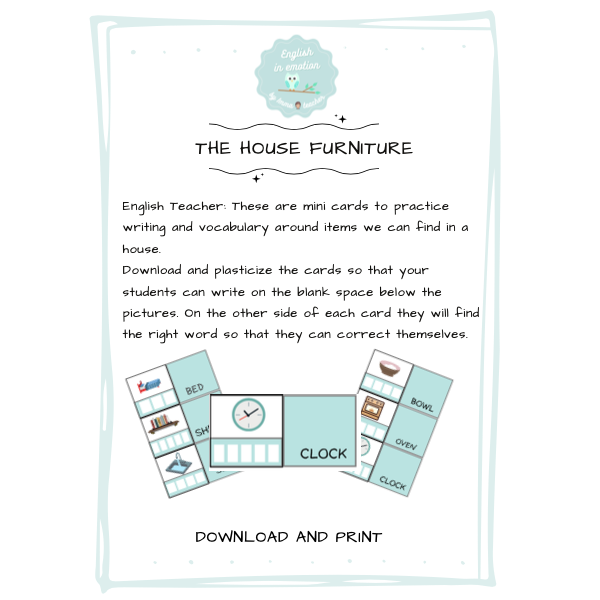 Mini book de 14 páginas en forma de acordeón con vocabulario básico sobre el tiempo, números, colores, vocabulario del colegio, juguetes, comida, juegos, partes del cuerpo y familia.
