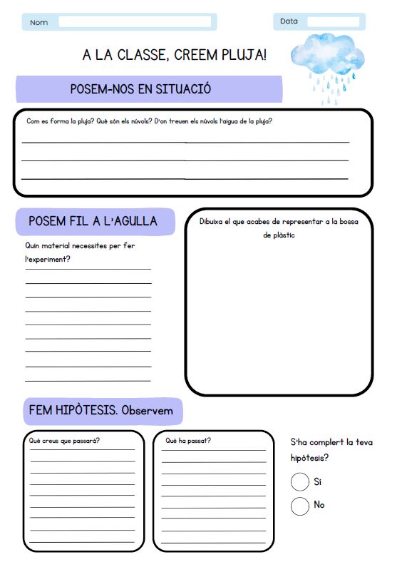 A la classe, creem pluja! És una activitat experimental per fer amb els alumnes. Aquesta ens permet fer hipòtesis sobre què passarà amb el cicle de l'aigua dins d'una bossa de plàstic i comprovar si les nostres hipòtesis són certes o no.