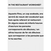 Aquesta fitxa, un cop acabada, ens servirà de resum del vocabulari que hem après referent al restaurant. En alguns casos els infants hauran d’escriure les paraules corresponents als dibuixos, i en altres hauran de fer els dibuixos que corresponen a les paraules que hi ha escrites.