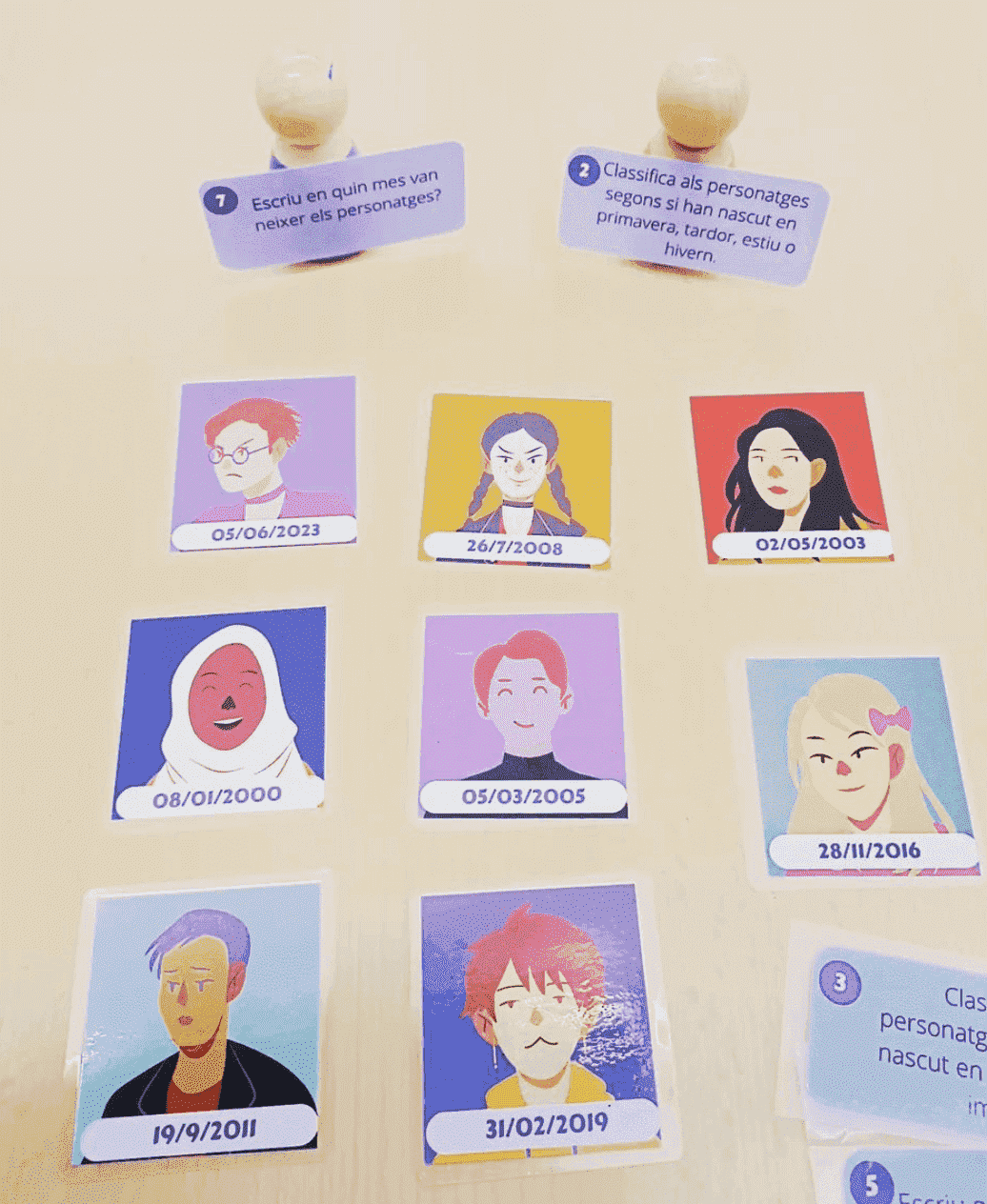 Sabent la data de naixement dels diferents personatges, l'alumnat ha de resoldre 8 reptes... Tals com: ordenar els personatges de més gran a més petit, classificar els personatges segons han nascut en un dia parell o imparell...