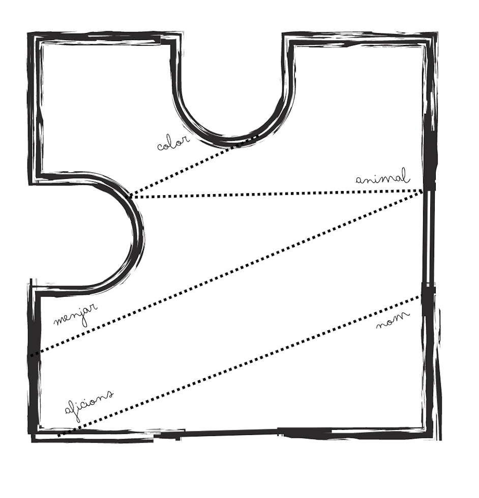 Puzle amb 25 peces per conèixer una mica més l'alumnat: nom, color, aficions, animal i menjar.
