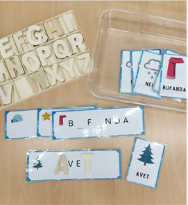 Amb aquest recrs treballem la consciència fonològica i la lectoescriptura. Es tracta de buscar la lletra que falta a cada paraula. El vocabulari està relacionat amb l'hivern.