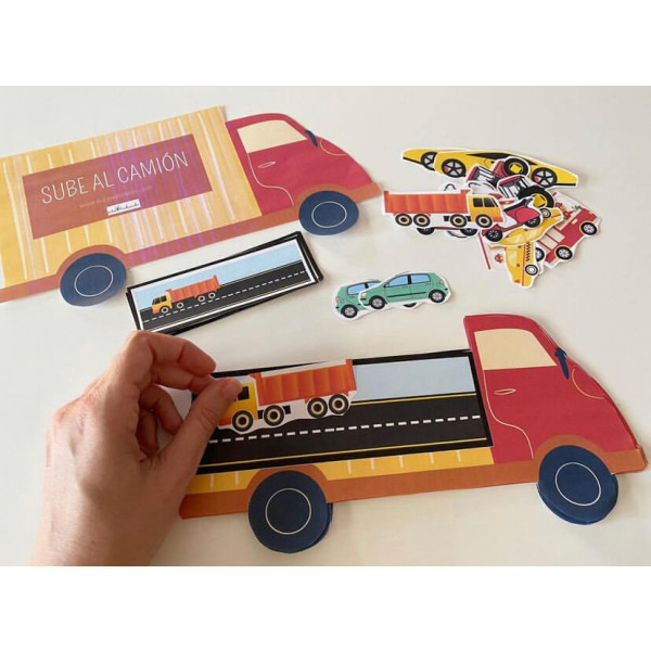 Juego de atención para subir al camión los vehículos que aparecen en las diferentes tarjetas de carreteras siguiendo el modelo.