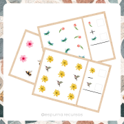18 tarjetas de sumas y restas (9 sumas y 9 restas) con imágenes de primavera.