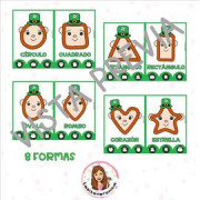 Contenido: Incluye 8 tarjetas individuales, con 8 formas geométricas con temática de San Patricio: círculo, cuadrado, triángulo, rectángulo, óvalo, rombo, estrella y corazón. En el archivo los encontrarás en tamaño A4 y A5.