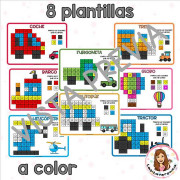 Contenido: Incluye 8 plantillas individuales: coche, furgoneta, helicóptero, tren, barco, globo, autobús y tractor.