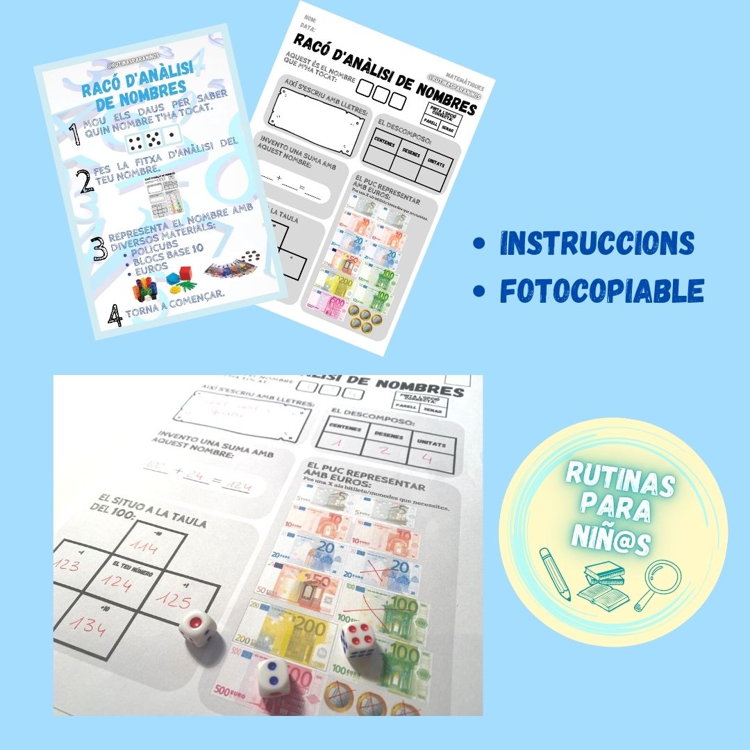 Anem a analitzar nombres. Per fer-ho haurem de llençar 3 daus. Si encara no coneixes nombres amb desenes no pateixis, utilitza només 2 daus (o 1!). Quan els daus et diguin el nombre l'hauràs d'analitzar: