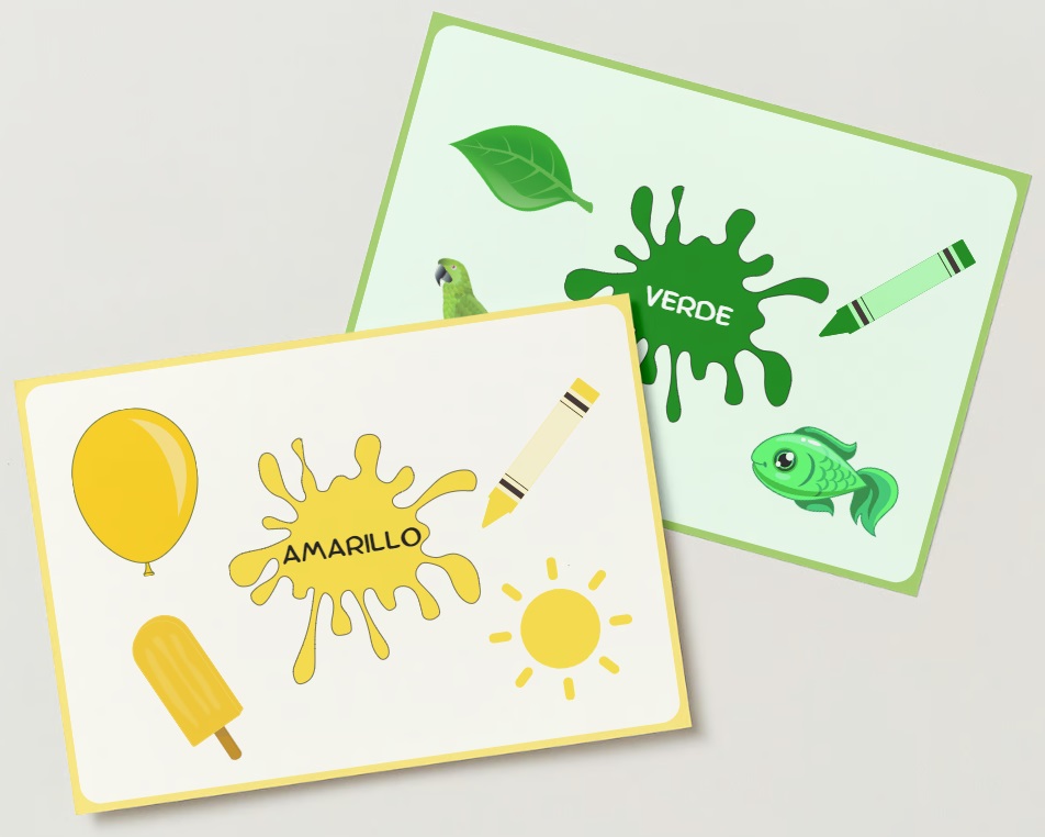 El conjunto incluye 11 tarjetas con los nombres de los colores y varios elementos de ese color. Cada tarjeta representa un color diferente y muestra una variedad de elementos que son de esa tonalidad.
