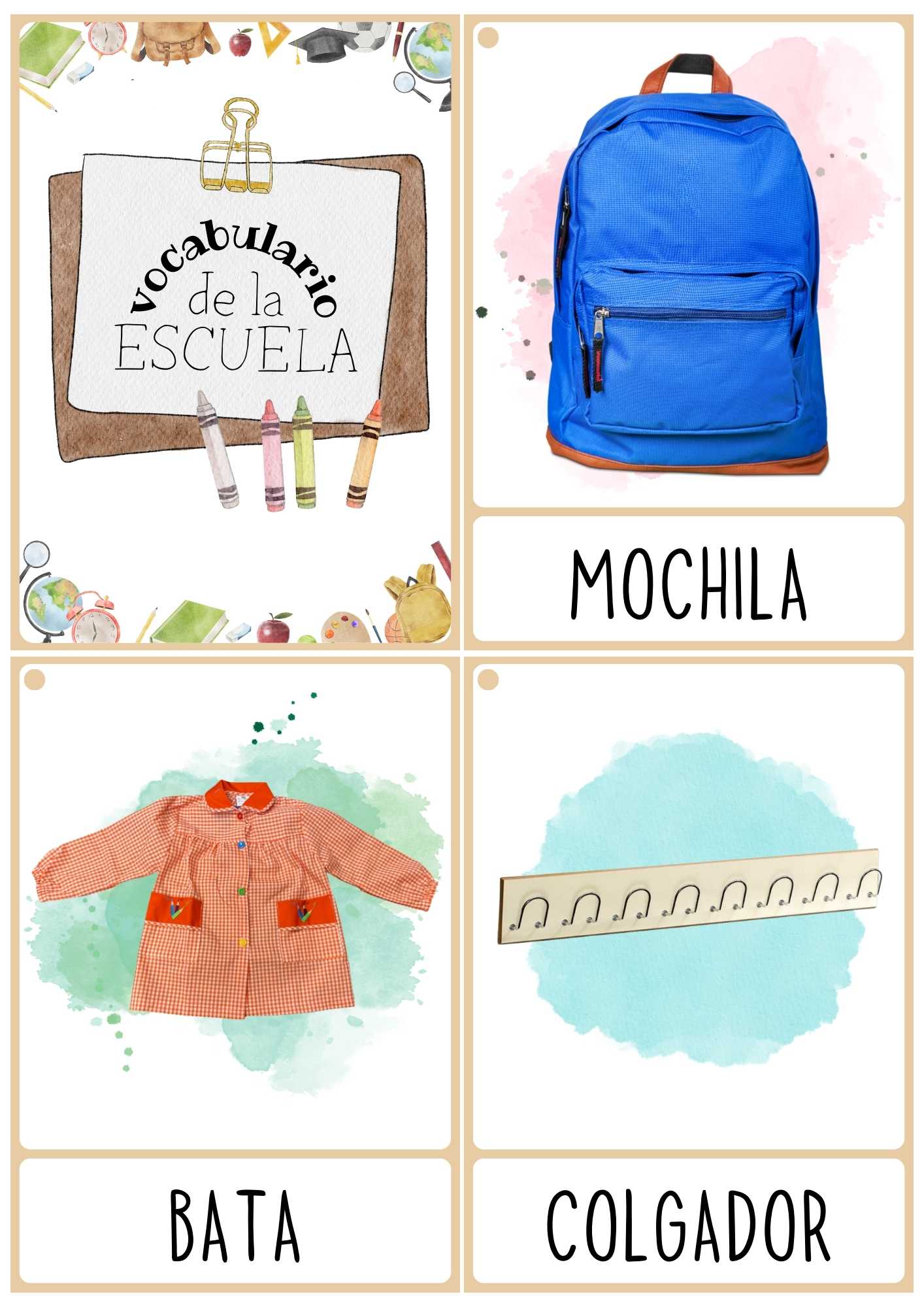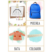 Targetas de vocabulario de objetos y elementos de la escuela con imágenes reales para propuestas de aprendizaje autónomo de lectoescritura. Se presentan en formato de 4 targetas por página para imprimir. Se pueden utilizar para trabajar el vocabulario oralmente en formato de bits o imprimiendolás a doble página para mostrar la parte delantera mientras se lee la palabra por detrás.