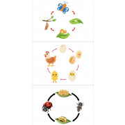 Este recurso ofrece diferentes materiales para trabajar el ciclo de la vida de diferentes insectos y animales: rana, mariposa, abeja, mariquita o pollito.