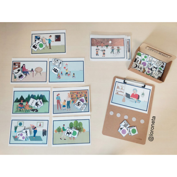 Un juego para hacer volar la imaginación e inventar historias. Contiene 35 cartas con personajes, lugares, objetos, medios de transporte, peligros y elementos de suerte o felicidad, que pueden enlazarse para crear acontecimientos e historias fantásticas. El material incluye 10 plantillas para guiar a los niños y a las niñas, que se inician en la escritura, a escribir acontecimientos o frases de la historia que han creado.