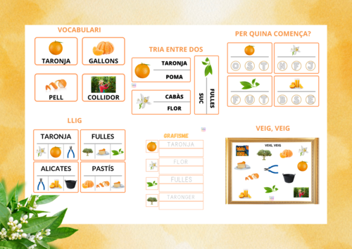 El dossier de la taronja és un material que conté diferents propostes de llengua, mate i jocs, tot relacionat amb la taronja.