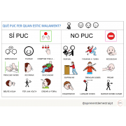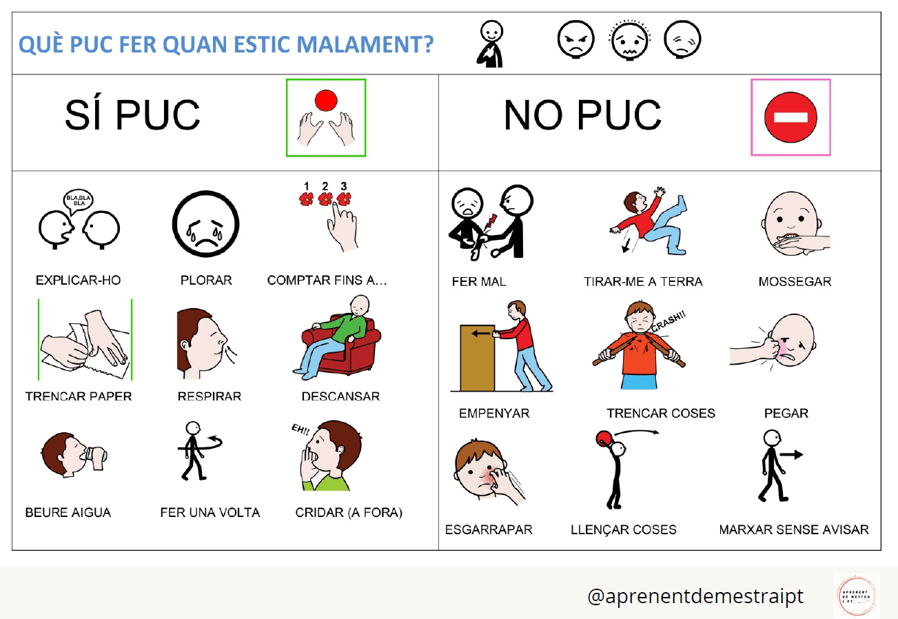 Taulell per treballar l'autoregulació de conducta a l'aula: accions que sí puc fer i accions que no puc fer. El pots tenir enganxat a l'aula plastificat i que pugui ser "portàtil" per si canvies d'aula. Pictogrames d'ARASAAC.