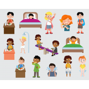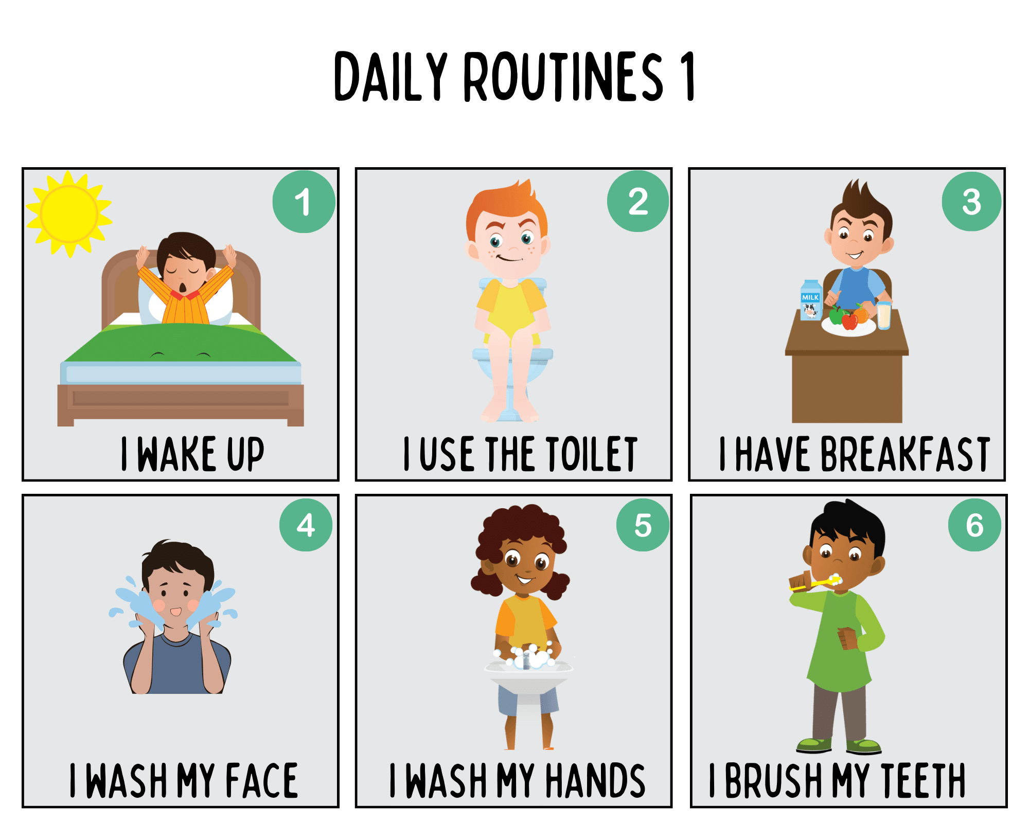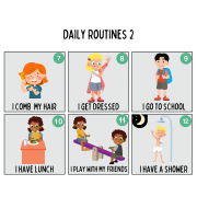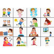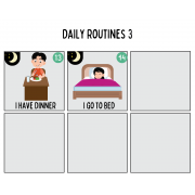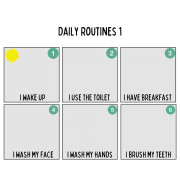 Se trata de una secuenciación de las rutinas diarias de los niños y niñas en inglés: me levanto, me lavo la cara, me cepillo los dientes, me cepillo el pelo, desayuno, voy a la escuela...La trabajamos, y una vez la hemos integrado, entre todos completamos los cuadrados en blanco con los dibujos de las rutinas. Para que sea más gráfico, al recortar el material podemos hacerlo como una sola fila larga.