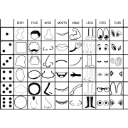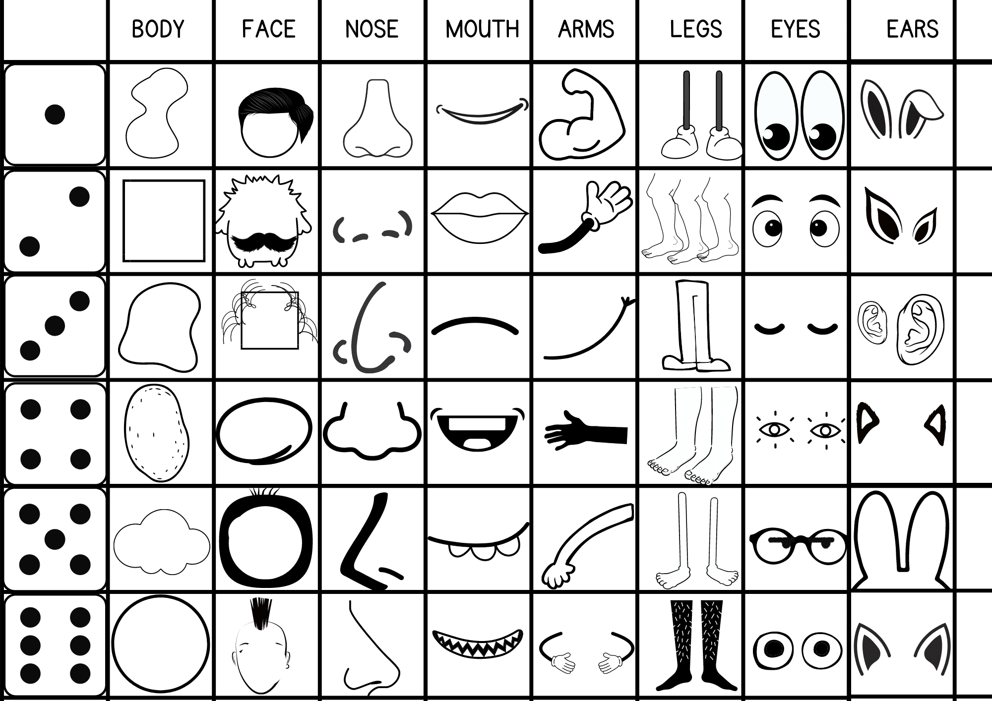 Se trata de un juego en el que tenemos una tabla de doble entrada donde hay los números del 1 al 6 en un lado, y las partes del cuerpo en otro lado. Para cada parte del cueerpo tenemos 6 dibujos diferentes. Un alumno tira un dado para que la maestra sepa cómo será la forma del cuerpo que tiene que dibujar en la pizarra. El siguiente lo tira y dependiendo del número que aparezca en el dado la maestra sabrá cómo tiene que ser los ojos. Y así consecutivamente hasta acabar el nuevo personaje, que seguramente quedará muy divertido.