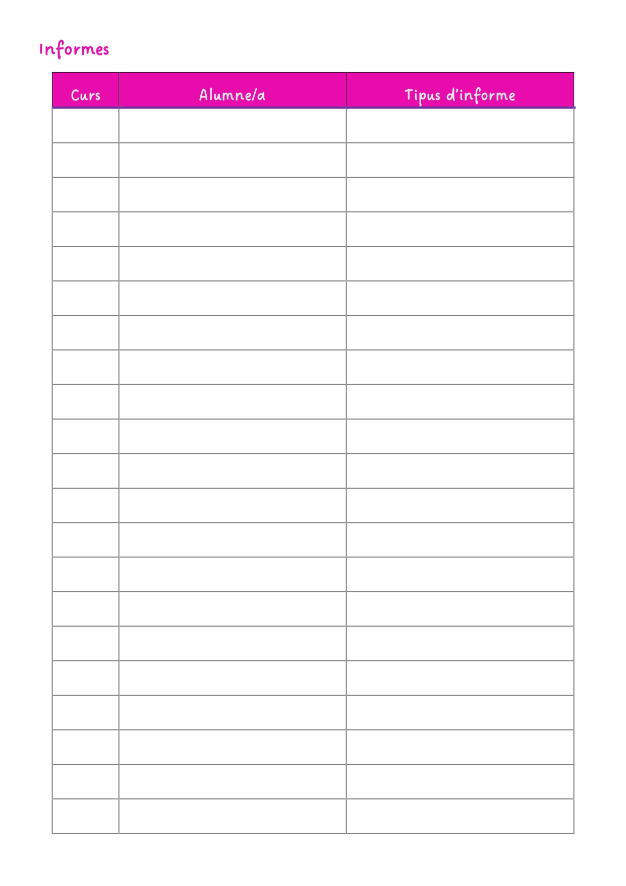 Registres per a reunions en format curt, regitres d'informes, de valoracions, d'alumnat NESE... Útils per a orientadors, PTs, ALs...