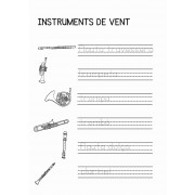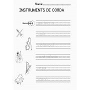 En cadascuna de les tres fitxes hi ha uns quants instruments de la família de la corda, el vent i percussió respectivament. HI ha el dibuix de cada instrument i la paraula en lletra deslligada amb punts per resseguir