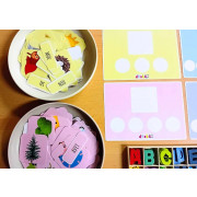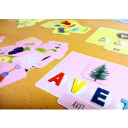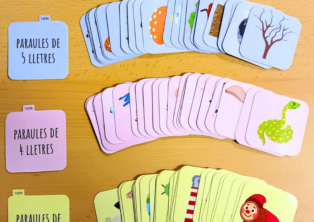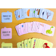 27 pàgines per imprimir amb dibuixos i paraules per fer diferents activitats, com ara confegir, associar imatge i paraula, fer jocs semàntics, treball de consciència fonològica, etc. Les imatges es divideixen en paraules de 3, 4, 5 i 6 lletres, diferenciades en colors. A més, hi ha unes targetes per posar-hi la imatge i confegir la paraula amb lletres de fusta o retolador.