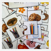 Conté 7 mini trencaclosques de dues peces cadascun: el got de llet amb les galetes, el niu amb els pollets, la cistella amb les pomes, la camisa amb els botons, el ram amb les flors, el plat amb la pizza i el pot de colors amb els llapis de colors.