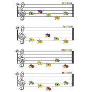 56 tarjetas numeradas con melodías variadas y de dificultad ascendiente. Escala de DoM y notas con los colores de los Boomwhackers.