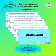 “Creciendo juntos” es un juego de roles que permite trabajar la gestión emocional individual y colectiva a través de situaciones cotidianas en la vida de un niño o adolescente. Contiene 33 tarjetas, cada una de ellas con una situación concreta a representar, entre dos o más personas, delante del resto de la clase. La situación descrita en la tarjeta servirá de base para representar la escena, pero cada persona puede añadir la información o gesticulación que considere necesarias para transmitir correctamente lo que su papel le pide.