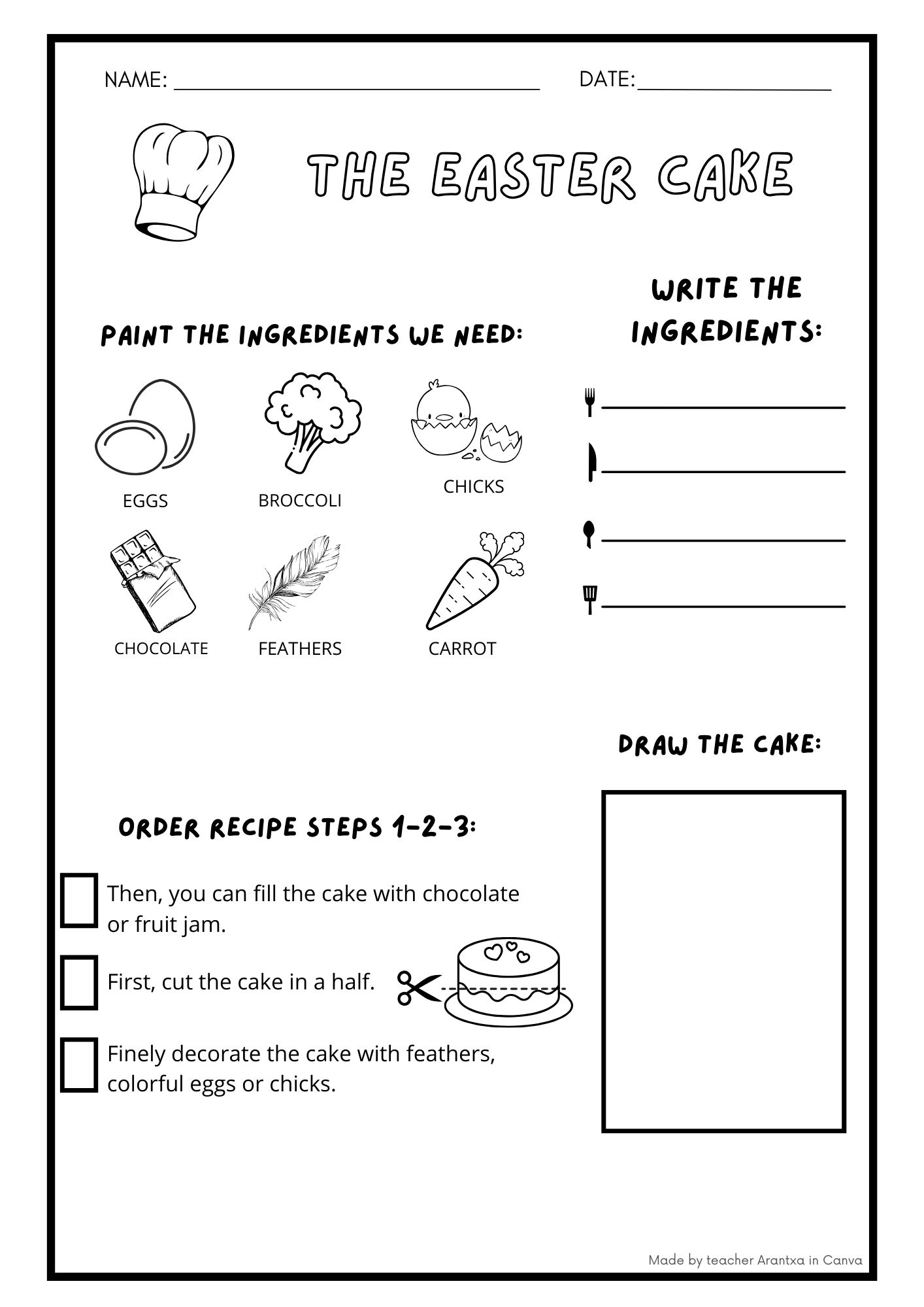 The goal is to make a recipe for the Easter catalan cake. So that all students can do it, there are different levels. From painting, drawing to reading and writing (including intermediate levels). Finally, there is also an extra activity of making another cooking recipe for those students who finish first or can progress more quickly.