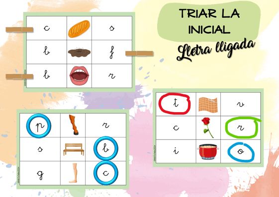 Recurs per a identificar el so inicial de les paraules i treballar la correspondència so-grafia en lletra lligada.
