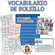Vocabulario de bolsillo o de letras móviles, con plantilla de letras en color negro, rojo y azul, además de incluir las vocales con las tildes, mayúsculas y minúsculas.