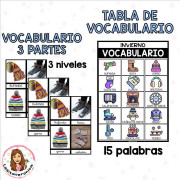 Vocabulario 3 partes con imágenes reales y 3 niveles de dificultad, 1 en mayúsculas y 2 en minúsculas.