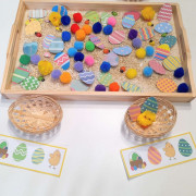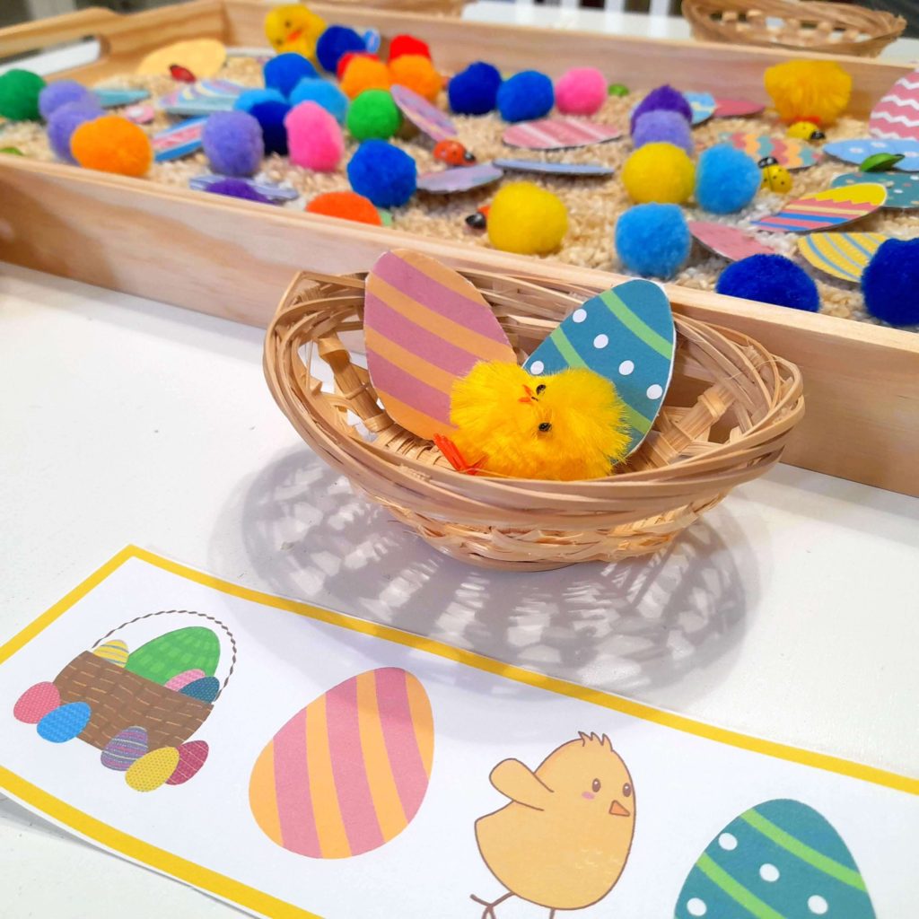 La primera propuesta es una búsqueda de los huevos de Pascua. En una bandeja he escondido los huevos de pascua y unos polluelos. Cada niño tiene su cesta y unas tarjetas. Tendrán que encontrar los huevos que salen en las tarjetas.