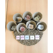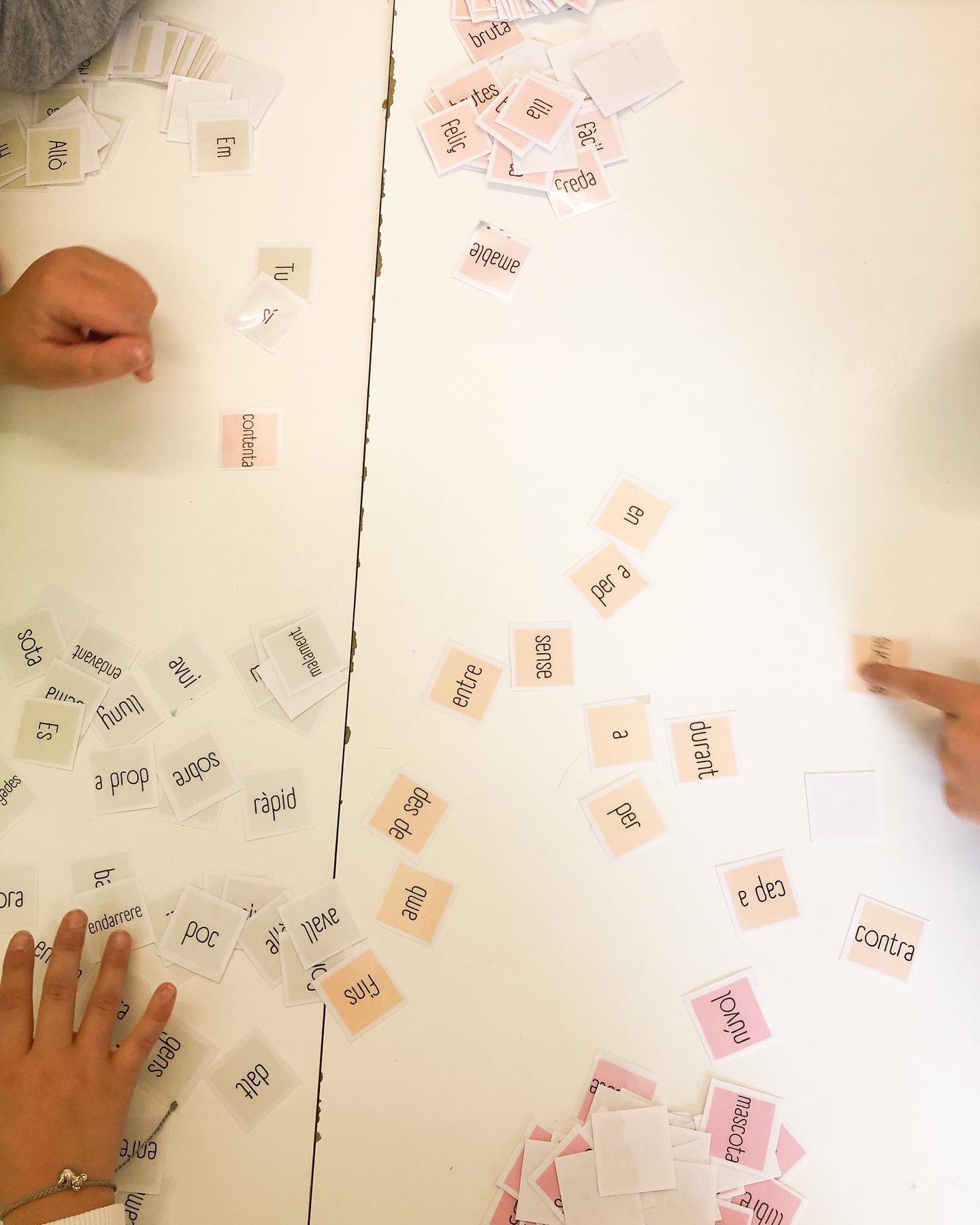 Targetes amb paraules de diferents categories gramaticals per crear oracions. Determinants, pronoms, noms, verbs, adejctius, adverbis, preposicions i signes de puntuació. Cada categoria gramatical té un color.