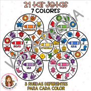 Contenido: Incluye 21 tarjetas en total, 3 diferentes por cada uno de los 7 colores que se trabajan: rojo, naranja, amarillo, verde, azul, lila y rosa.