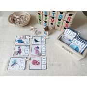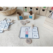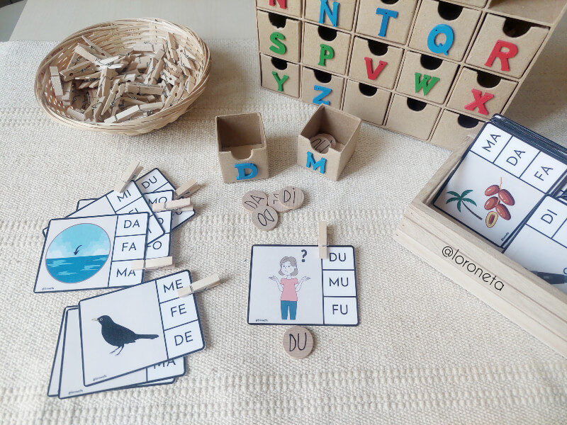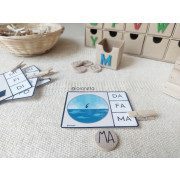 Conjunt de 72 targetes d'elecció múltiple on posem l'atenció en la pràctica lectora de síl·labes directes. Per a facilitar la dinàmica, en aquest bloc de targetes treballarem únicament els fonemes /D/, /F/ i /M/. Abans que els infants puguen jugar de manera autònoma, ens assegurarem que totes i tots identifiquen els conceptes que apareixen a les targetes. Per això, primer presentarem el material i farem la proposta conjuntament (en gran grup o en grup xicotet) fins que el vocabulari estiga ben consolidat. Quan xiquetes i xiquets ja estiguen preparades/preparats per a fer ús del recurs de manera autònoma, simplement hauran d'enganxar una pinça a la síl·laba corresponent. Si voleu, podeu col·locar un gomet al darrere de la resposta correcta perquè les targetes siguen autocorrectives.