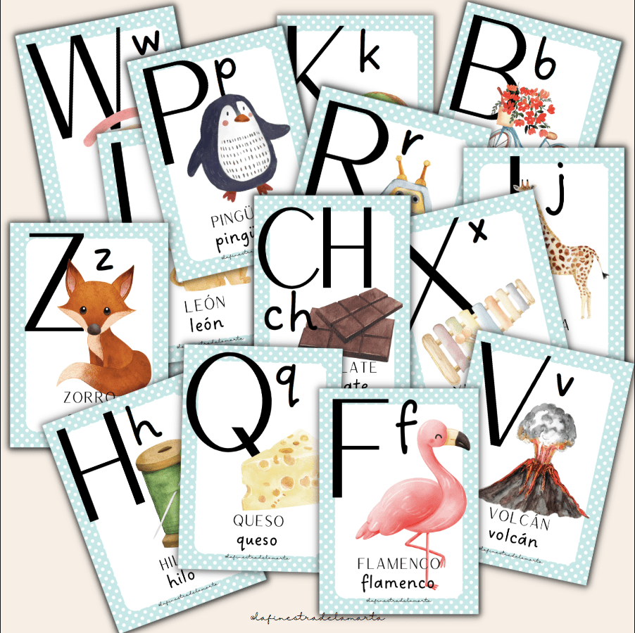 Modelo 1: Incluye la letra en mayúscula y minúscula, la imagen y palabra correspondiente en los dos tipos de letra.