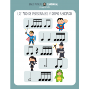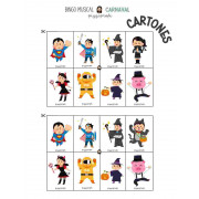 Este es un Bingo que he creado para Carnaval. Está compuesto por 10 personajes diferentes, cada uno con su disfraz y al que le corresponde un ritmo distinto. Esto significa que, cuando interpretes este ritmo, deberán identificarlo con su personaje y tacharlo del cartón. Hay un total de 40 cartones diferentes.