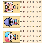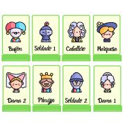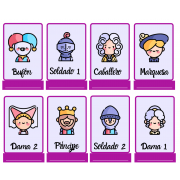 Juego tradicional del quién es quién, con una temática medieval. Tienes que imprimir todo el documento. Las páginas de rectángulos con fondo blanco, son la base del tablero. Las páginas que aparecen en rectángulos morados o verdes con personajes, son la fichas que van encima del tablero. Hay que recortarlas, doblar la parte ancha de color y dicha parte pegarla sobre la parte ancha del tablero, así, se nos quedaran las piezas levantadas. Las últimas hojas del documento, son las cartas de los personajes. Se imprimen, se dobla la página por la mitad y se recorta. Así nos quedarán las cartas con su derecho y su revés.