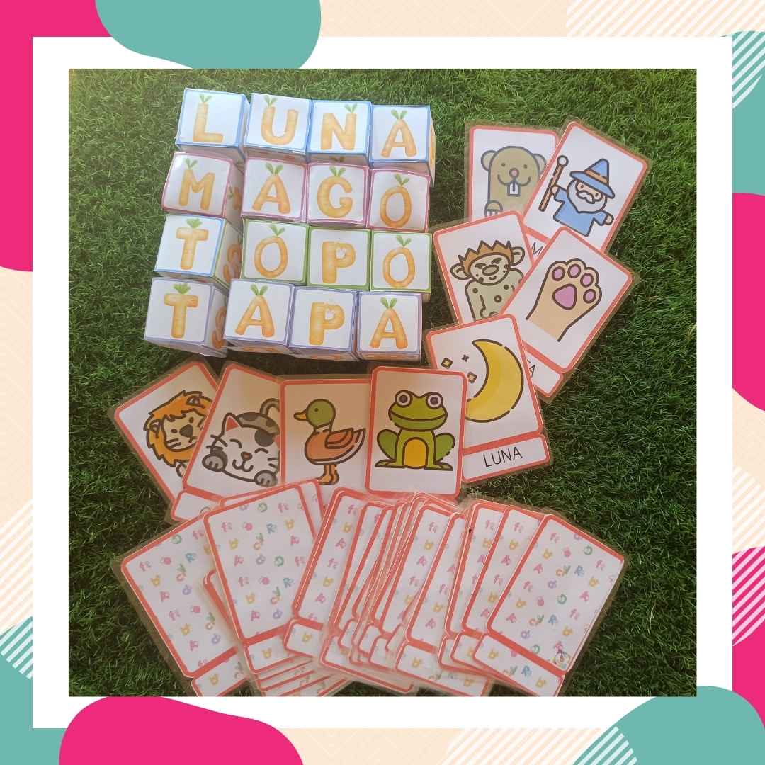 Juego de cartas y dados para afianzar el reconocimiento de letras y la lecto escritura.