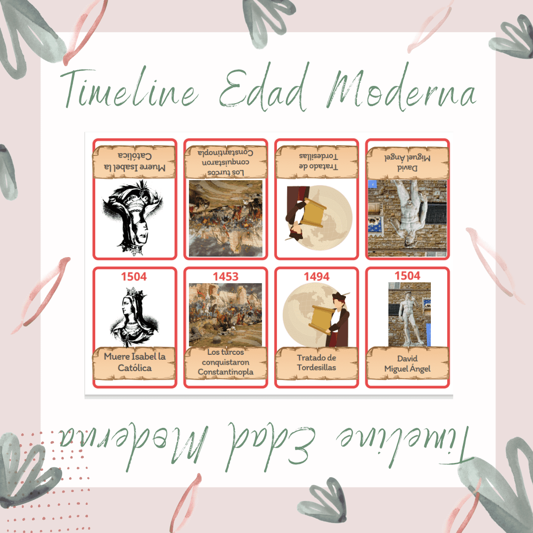 Juego compuesto por 54 cartas, similar al Timeline tradicional. El juego consiste en colocar las cartas en orden cronológico. El recurso cuenta con un total de 19 páginas (instrucciones, cartas). El recurso se descarga a través de un enlace.