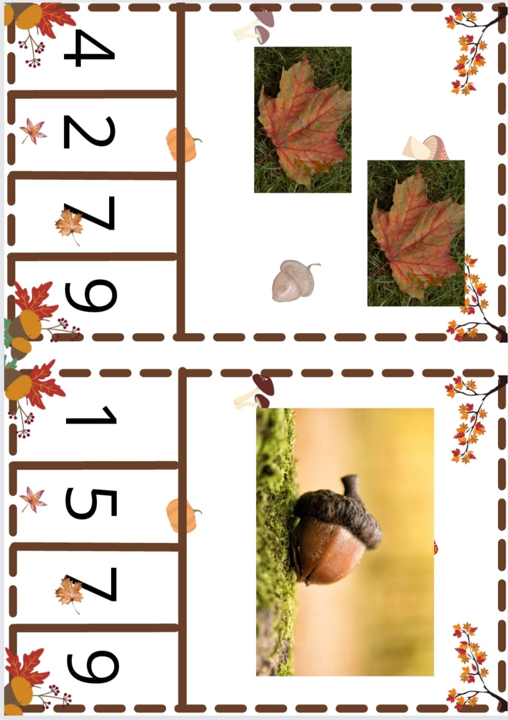 És un recurs de matemàtiques inspirat en la tardor, per educació infantil. S'ha de posar una pinça al nombre corresponent.