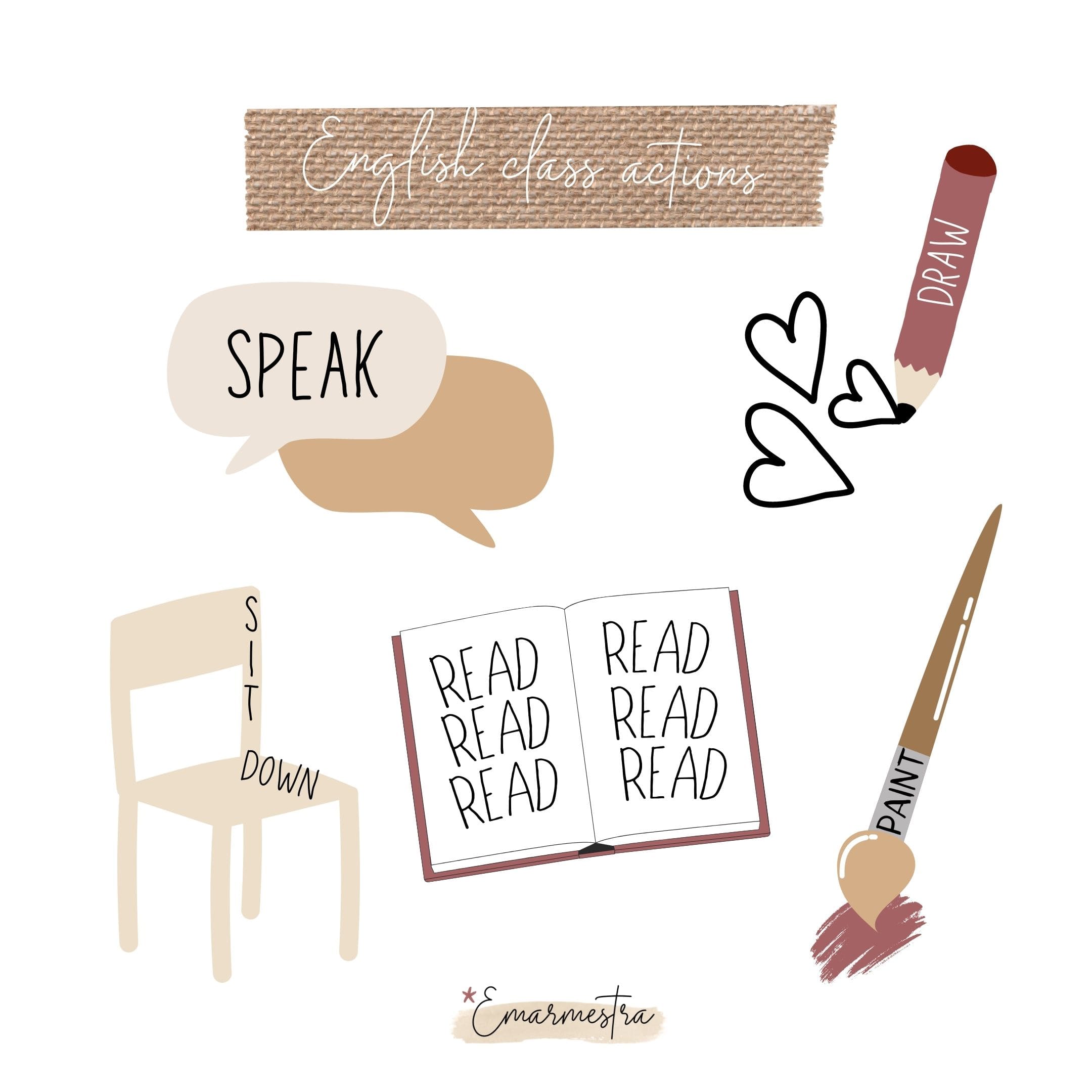 16 accions il·lustrades per facilitar la comprensió dels verbs més utilitzats a l'aula d'anglès: write, read, cut, paste, listen, speak, sit down, stand up, clean, search, count, sing, dance, erase, paint and draw.