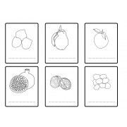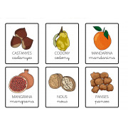 Material per a treballar el vocabulari dels fruits de la tardor, inclou targetes amb imatges a color, fitxes imprimibles amb els dibuixos en blanc i negre i cartons de bingo.