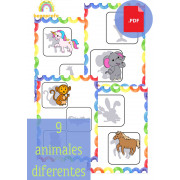 - 1 documento en PDF con 9 animales diferentes y sus correspondientes sombras. 6 páginas en tamaño A4