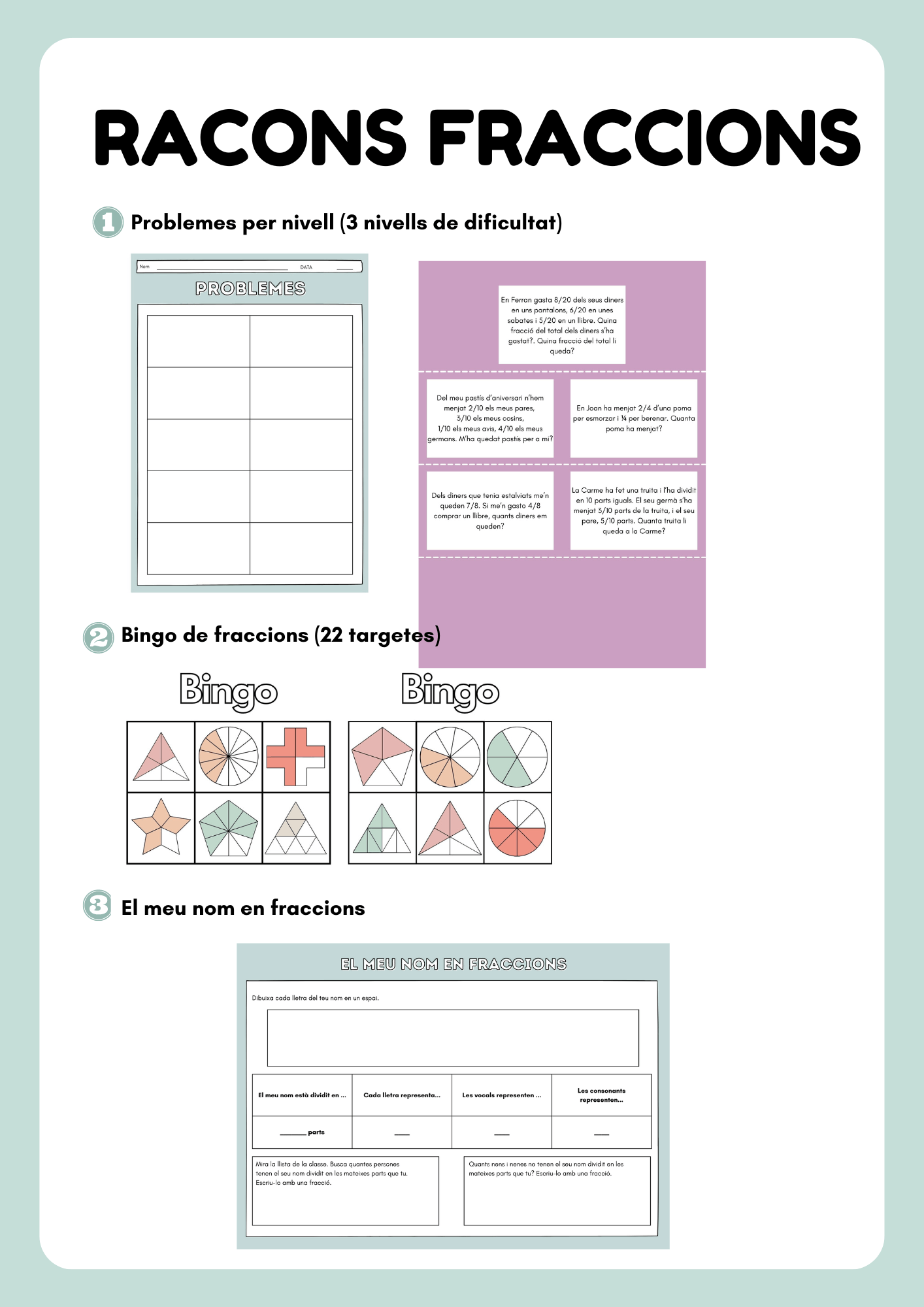 - Problemes. 3 nivells de problemes en targetes individuals + fitxa de resolució