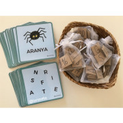 El material presenta un conjunt de 40 targetes per a treballar la lectoescriptura. L'objectiu és jugar a descobrir quina paraula s'amaga entre un embolic de lletres. Podeu escriure en un full o en la pissarra les paraules que van sortint, o utilitzar, com en el nostre cas, lletres mòbils de fusta o de cartó. Per a facilitar la tasca als infants, cada set de lletres que confegeixen la paraula van agrupades en una bosseta. El material inclou unes targetes "control" que tenen la paraula desembolicada amb el seu dibuix, de tal manera que els infants poden comprovar la resposta de forma autònoma.