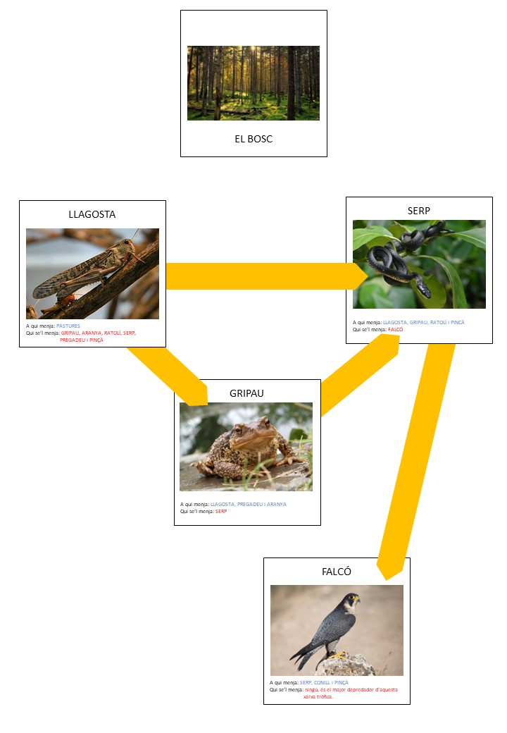 A cada ésser viu conta el seu nom comú, una imatge de bona qualitat, els éssers vius dels quals s'alimenta i els éssers vius que s'alimenten d'ell.
