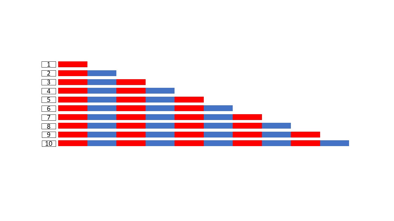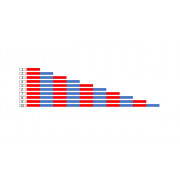 Este material manipulativo Montessori incluye 10 barras con segmentos de colores en rojo y azul que representan del 1 al 10.