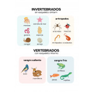 · Exploración: Proporcione el póster a los niños y anímelos a observar e identificar a los diferentes animales, clasificándolos entre vertebrados e invertebrados. Hágales descubrir los subgrupos de cada categoría con la ayuda de las ilustraciones representativas.
