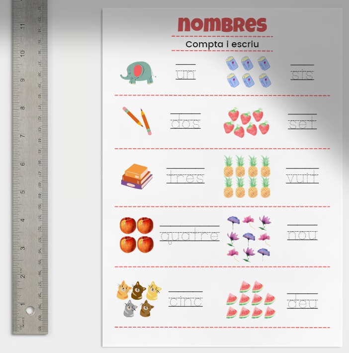 Aquest material és ideal per a utilitzar en entorns educatius, a casa o en escoles. Fomenta l'aprenentatge actiu i interactiu mentre els nens compten i es familiaritzen amb les lletres que formen els nombres.