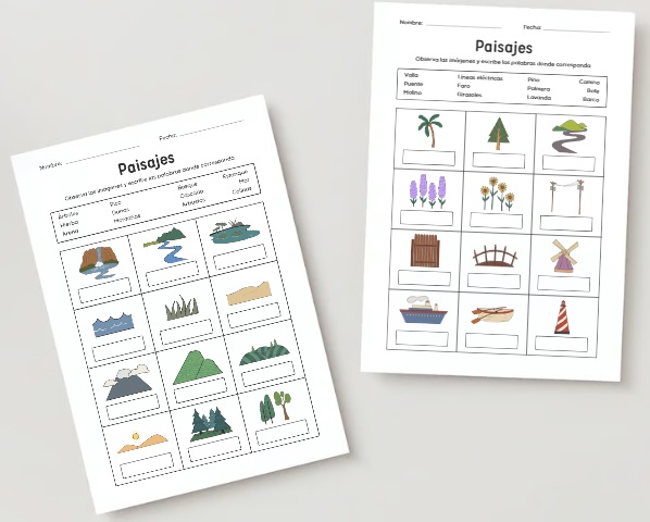 · Exploración y escritura: Proporcione las láminas a los niños y animarles a observar las imágenes de los paisajes y escribir los nombres correspondientes a los espacios vacíos. Las dos primeras láminas con el recuadro proporcionan un soporte adicional, mientras que las otras dos representan un reto más avanzado.