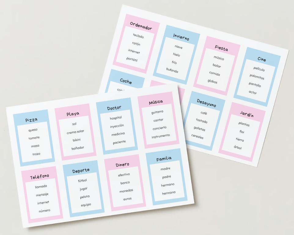 Estamos emocionados de presentarles un conjunto de láminas imprimibles que le permitirán disfrutar del popular juego del tabú de manera educativa y divertida: "Juego del Tabú".